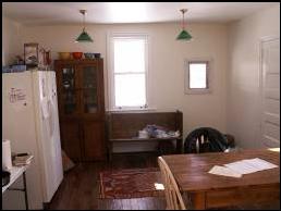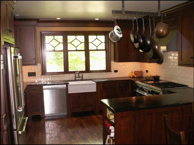 The window above the apron front sink was enlarged and displays a grid pattern that matches other existing windows. The door to the right was closed and a new entry created through a new mudroom. The eating area and working area were flipped to allow an uninterrupted working area that does not need to be passed through to get to the eating area. Soapstone countertops have integral draining boards on either side of the sink. |
